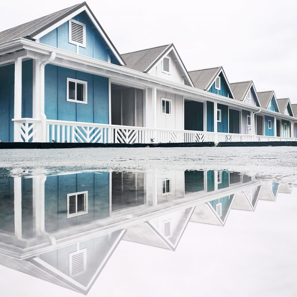 Beach Boxes by Cooper Black captures a tranquil post-storm moment along the coast. The print features a row of small beach boxes lined up along a road, with a large pool of water reflecting the small structures and the sky above. The muted, soft colours of the scene create a calming atmosphere, showcasing the quiet beauty after a storm.