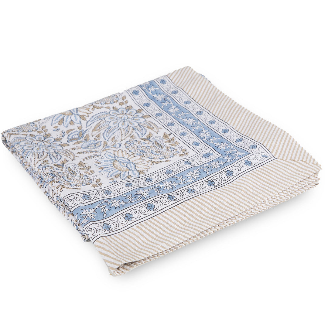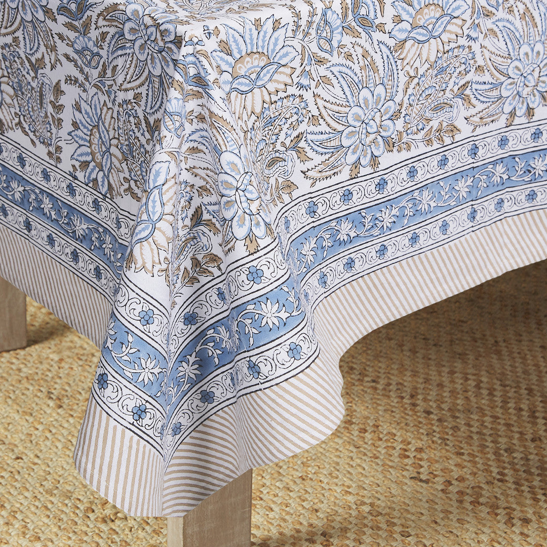The Bromley Tablecloth in Cornflower features a beautiful floral design in shades of blue and taupe on a white cotton base, finished with a stylish striped edge.