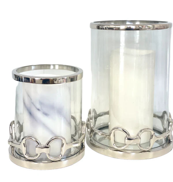 Elevate your décor with the refined charm of our Silver Hurricane with Horsebit Detail. Finished in a polished silver tone, this elegant candle holder is adorned with a classic horsebit accent, bringing a hint of equestrian-inspired sophistication to your space.