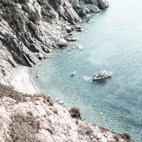 Docking by Cooper Black captures the serene luxury of an exclusive getaway. The image features a sleek, expensive yacht anchored in a secluded cove, with a private beach nestled between rugged cliffs. The muted, washed-out colours evoke a sense of calm and solitude, enhancing the peaceful atmosphere of this hidden paradise.