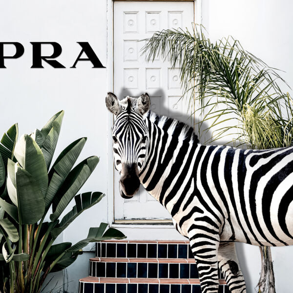Emerson is a captivating artwork by Cooper Black, featuring a zebra standing in front of a striking white door. The bold black-and-white stripes of the zebra create a powerful contrast with the simplicity and elegance of the white door, blending the wild with the refined. The clever wordplay on "PRADOOR" subtly references the iconic luxury fashion brand, Prada, adding a touch of wit and sophistication to the piece.