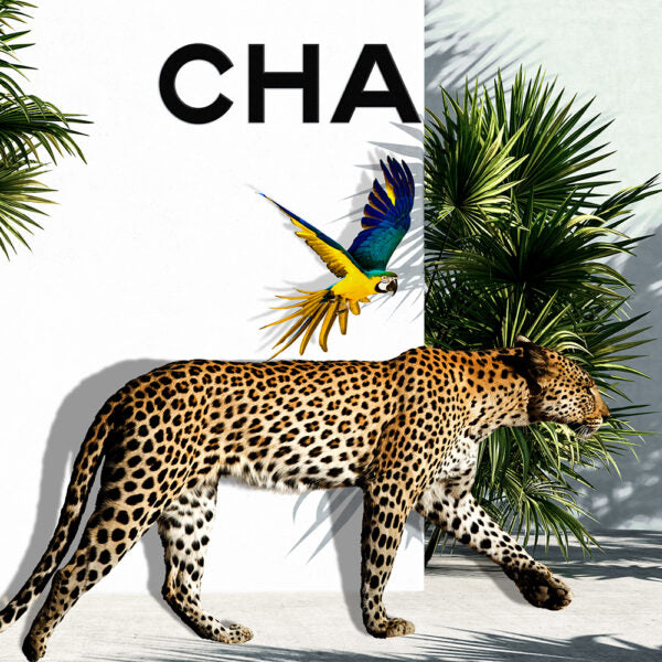 Hunter by Cooper Black is a bold and dynamic photograph that brings together the beauty of nature and the world of high fashion. The image features a vibrant parrot and a powerful tiger, standing confidently in front of a stark white wall adorned with the iconic beginning letters of Chanel – "CHA". In the background, fan fronds gently frame the scene, adding a sense of tropical elegance.