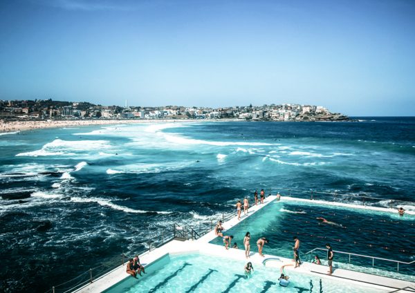 Icebergs by Cooper Black is a striking depiction of the iconic ocean-side pool, where crystal-clear blue water meets the vast, deep blue ocean. The scene is brought to life with people swimming and standing along the edges of the pool, capturing the energy and vibrancy of a summer day. In the distance, a city coastline and sandy beach stretch out, adding a sense of place and serenity to this breathtaking composition.