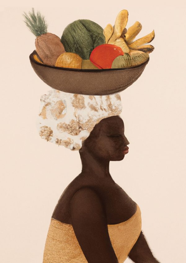Kola by Cooper Black is a striking and refined piece that beautifully captures the strength and grace of a North African woman balancing a bowl of fruit atop her head. This powerful image conveys poise, resilience, and a deep connection to cultural heritage, with the woman standing as the central focus against a minimalist backdrop. The intricate details of the fruit and the fluidity of her movement bring life and depth to the composition.