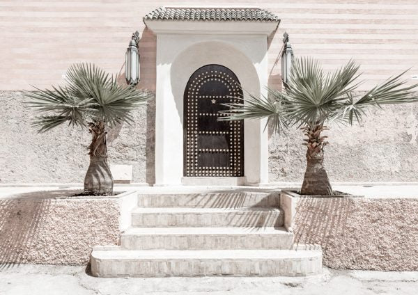Pastel Pink Palm by Cooper Black is a beautiful, calming photograph that blends architectural elegance with natural beauty. The image features a palm tree standing gracefully beside a Moroccan door, framed by a textured building. The upper half of the building is painted in a classic white, while the bottom features a warm, neutral-toned texture, creating a striking contrast. Stairs lead up to the door, inviting a sense of mystery and discovery.