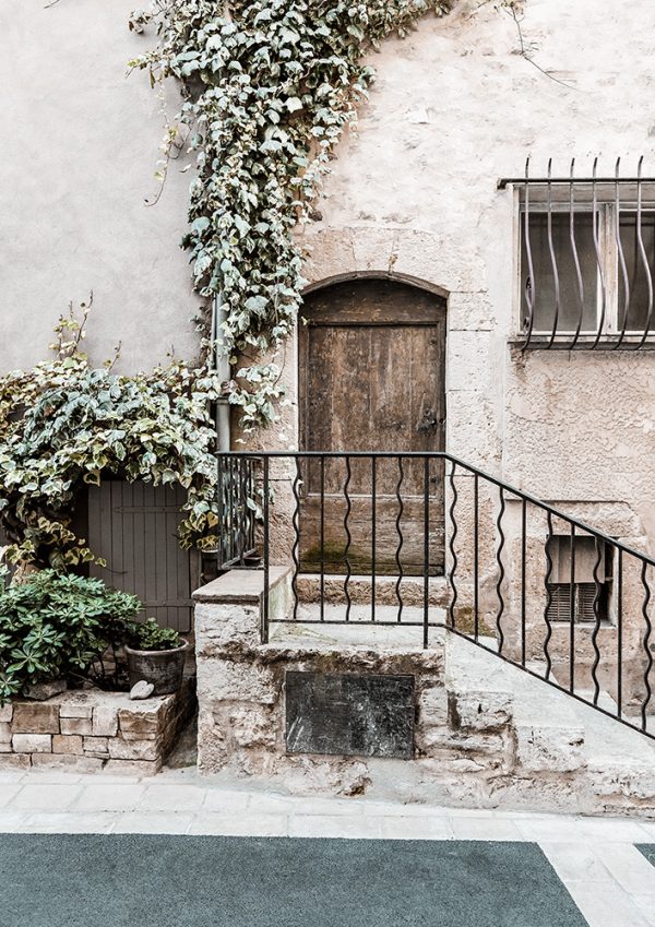 Patio by Cooper Black captures the rustic charm and timeless beauty of Greek architecture. The photograph features a worn mid-brown archway door alongside a blue door on the left, set against a building with soft, light brown walls. Stairs lead from the door, framed by black rails, adding a sense of depth and character to the scene. The muted, weathered tones of the doors and walls evoke a serene, Mediterranean atmosphere.