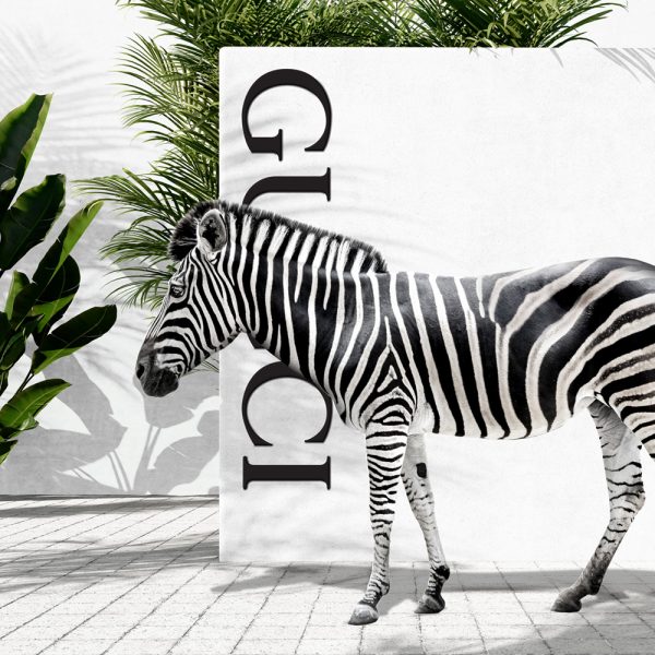 Reggie by Cooper Black is a striking photograph that blends the elegance of high fashion with the beauty of the natural world. The image features a zebra standing in front of a white wall, with the iconic Gucci logo behind it. The scene is complemented by vibrant palm leaves in the background, adding an exotic touch to the minimalist composition.
