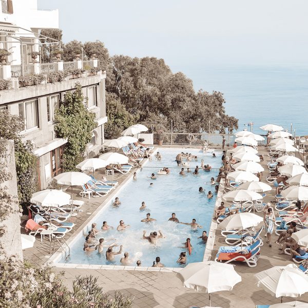 Spanish Poolside by Cooper Black showcases a serene, sun-drenched scene centred around a stunning pool that overlooks the ocean. The pool takes centre stage, with people swimming and lounging around it, adding life to the peaceful atmosphere. A cement grey building stands to the left, complementing the soft, washed-out colours of the setting. The overall mood evokes a sense of relaxed luxury, capturing the essence of Mediterranean leisure.