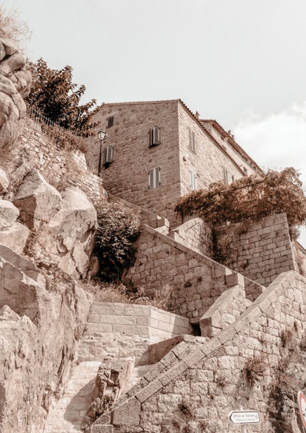 Stone Villa by Cooper Black is a beautifully muted and atmospheric photograph that evokes the timeless charm of rustic architecture. The image features aged stone brick stairs leading up to a stone villa, with the scene presented in soft, muted tones. Brown shrubbery surrounds the area, with a stone cliff face on the right adding texture and depth, enhancing the earthy and weathered aesthetic of the scene.