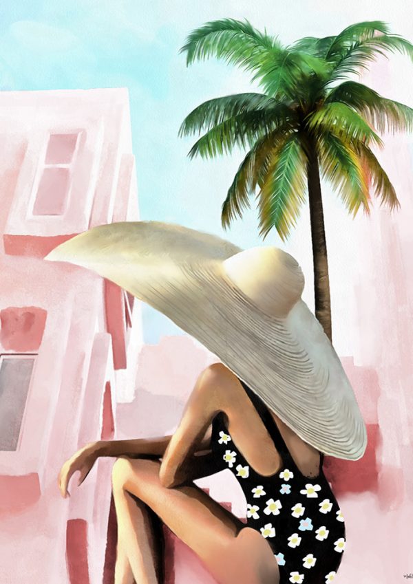 Summer Palm by Cooper Black exudes the relaxed, sun-soaked charm of a perfect summer day. The painting features a woman in a bathing suit and a large straw hat, sitting on a pink street, gazing at the buildings around her. A single palm tree adds to the tropical vibe, completing the scene with a sense of calm and warmth. The soft pastel colours and serene atmosphere invite you to unwind and imagine yourself in this idyllic summer setting.