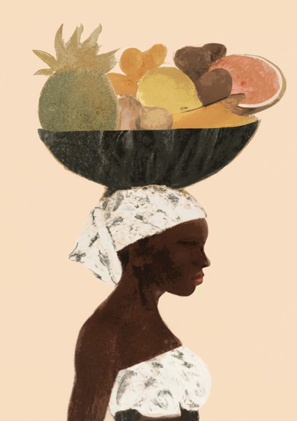 Thema by Cooper Black is a striking and elegant piece that captures the grace and strength of a North African woman carrying a bowl of fruit atop her head. The image embodies a sense of poise, resilience, and cultural heritage, with the woman's figure framed against a minimalistic background that allows her to take centre stage. The careful details of the fruit and the fluidity of her posture add depth and life to the artwork.