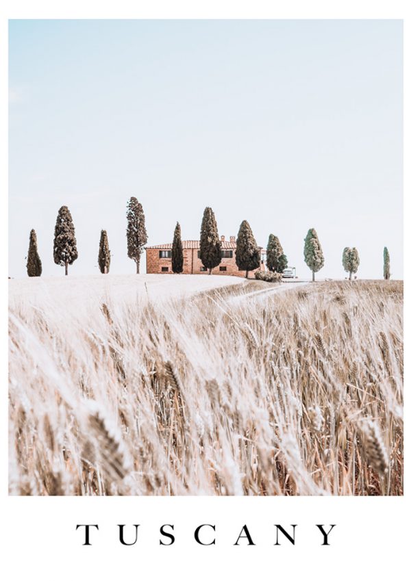 Experience the timeless beauty of the Italian countryside with Tuscany by Cooper Black. This serene print showcases a tranquil field of long brown grass, gently swaying in the breeze. In the distance, a traditional Italian brick home stands proudly, framed by a row of trees that lead the eye towards the horizon. The soft, earthy tones and rustic charm of this piece capture the peaceful essence of rural Tuscany.