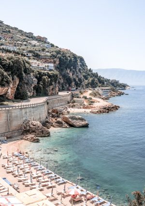 Vlore Vertical by Cooper Black captures the breathtaking beauty of a coastal drive along a winding cliffside. The photo showcases the road meandering along the edge of the cliff, with a stunning view of the sparkling blue ocean below. At the bottom of the image, sunbeds are laid out, inviting relaxation in this tranquil, sun-soaked setting. The composition brings together the rugged beauty of the coastline with the serene luxury of a Mediterranean escape.